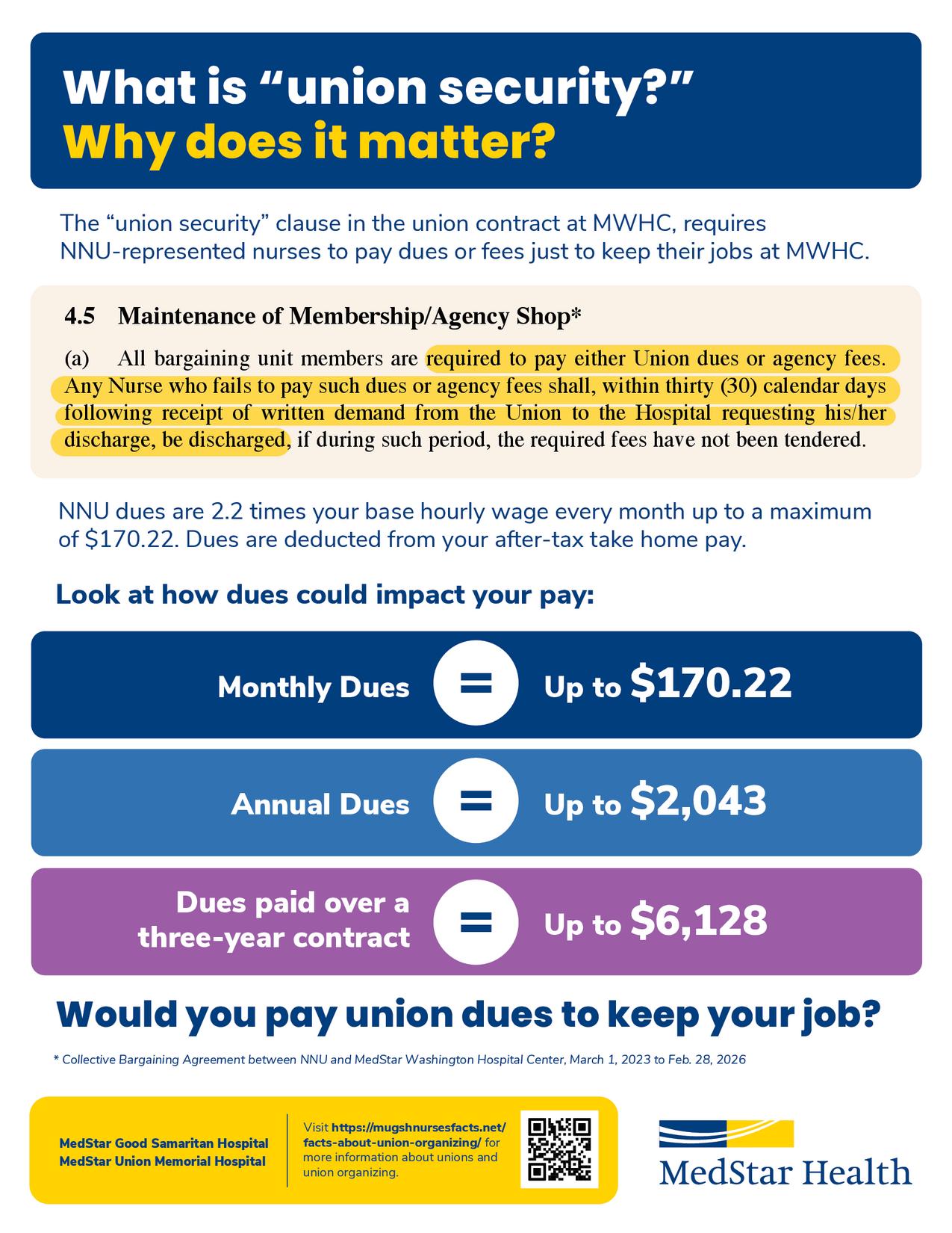If National Nurses United (NNU) unionize nurse associates at MedStar Union/Good Samaritan Hospitals you will be required to pay monthly dues to NNU. Dues are deducted from your after-tax take home pay.